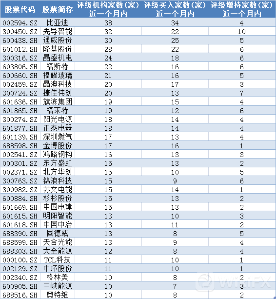 从机构评级来看,近一个月共有32只光伏概念股获得了10家以上机构的看好,给予了公司“买入”或者“增持”的积极评级。其中,比亚迪(38家)、先导智能(32家)、通威股份(30家)、隆基股份(28家)、晶盛机电(24家)、福斯特(22家)、福耀玻璃(21家)、晶澳科技(20家)、捷佳伟创(20家)等9只龙头股更是得到超20家或以上的机构扎堆看好。