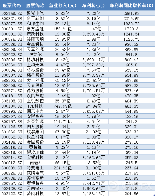 此外,光伏企业业绩也向好。据统计,光伏板块半年报共有76家公司营收同比增幅100%,其中智光电气、金开新能、和邦生物、东方盛虹、康跃科技、洛阳玻璃等6股上半年净利润同比增幅超过1000%。