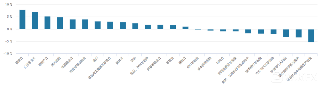 从行业板块表现来看,能源、公用事业、多元金融表现靠前,而半导体、医疗保健等表现相对较弱。(见图2)