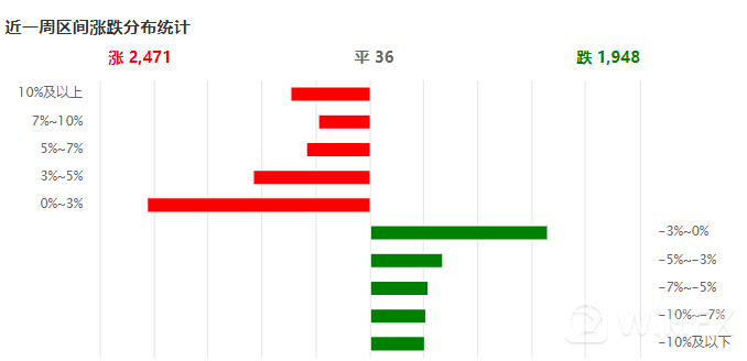 本周个股上涨家数超过下跌家数,上涨股票大部分集中在0~3%,下跌股票则大部分集中在-3~0%及以下,市场赚钱效应尚可。(见图6)