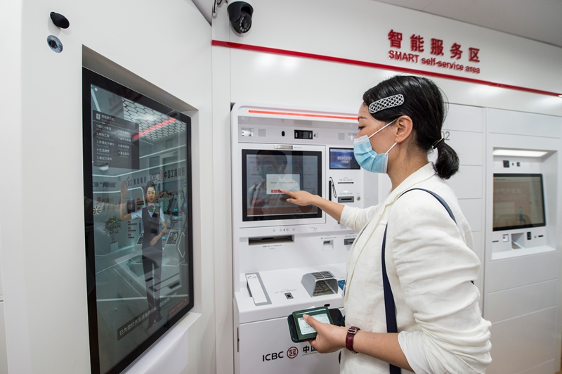 在2021年中国国际服务贸易交易会金融服务专题展上,“智·库·云银行”是工商银行的创新项目,该项目以集装箱为载体打造全新离行服务模式,利用数字孪生、物联网、5G通信等技术手段,结合银行自助机具,为客户提供方便灵活的金融服务。图为客户通过远程客服指导办理相关业务。
