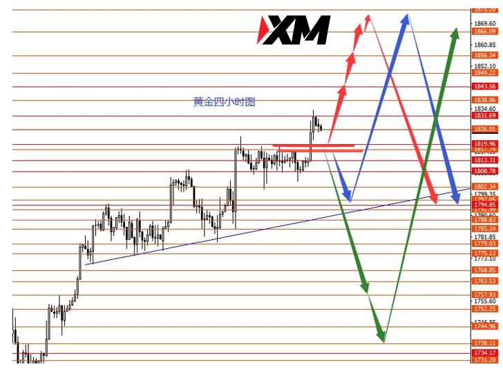 黄金月初盘整后直接拉涨,周图收阳柱。从图形来看,本周在1802没成功跌破前,继续向上震荡上行的概率较大些,若跌破1802后,再关注黄金是震荡盘整后继续向上,还是跌破单边趋势线后向下大幅回调,蓝绿线备选。今日操作建议:1820至1817区域做多,止损1801,目标看向1844和1856,再看向1866和1875。若能到达1866后,建议全部平仓离场观望,再等待向下信号出现后择机做空。控制仓量,严格止损。