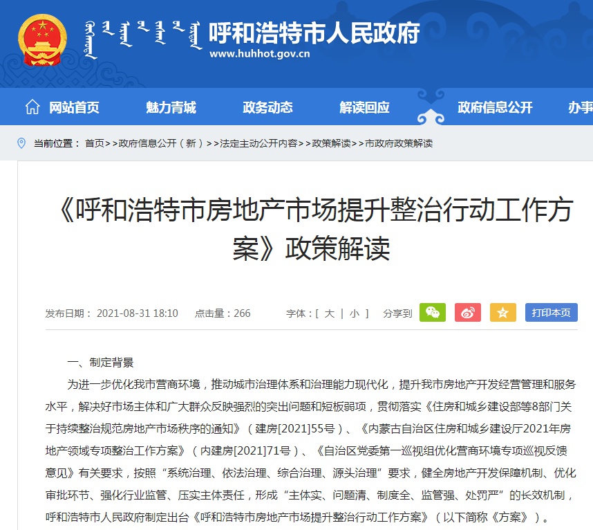 8月31日,呼和浩特市住建局解读《方案》称,主要内容方面,《方案》共分为工作目标、实施范围、组织机构、工作任务、工作要求五个部分,重点通过优化土地供应结构、加快建设工程审批速度、强化工程品质管理、打击销售市场乱象、规范房地产交付流程、提升不动产办证速度等方面入手,完成八项任务: