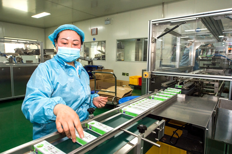 近年来,河南叶县农商银行突出信贷投放重点,积极提升金融服务民营企业水平,持续落实减费让利政策,支持实体经济发展。疫情发生以来,该行已向辖内民营企业累计发放优惠利率贷款51.32亿元,为企业减费让利2100万元。图为该行信贷支持的天健日化企业车间一角。 本报记者 刘志良 摄