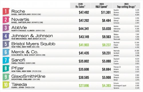 此外,瑞士对创新研究的巨大研发投入也是一个重要原因。2019年,瑞士在生物医药领域的研发支出约占国内生产总值的3.15%[1],这个数值与美国相持平。2020到2021年,罗氏从全球前10节节攀升之后,终于登顶“制药第一”,在这背后,其2020年的研发总投入就高达139亿美元,占其总营收的22.2%[2]。