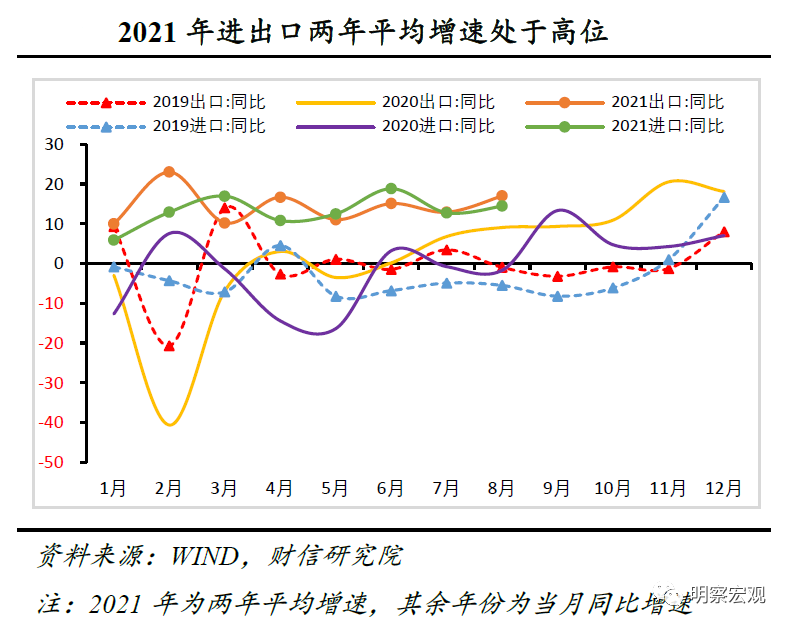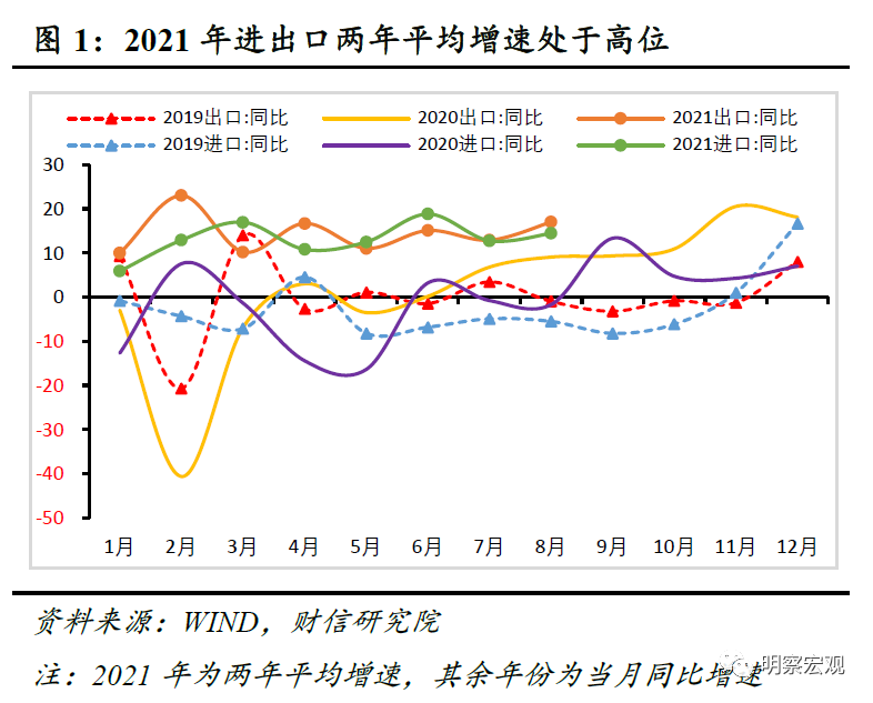 8月份进口金额较2019年同期增长31.0%,两年平均增速14.4%,较7月份提高1.7个百分点,处于过去三年以来的高位(见图1)。