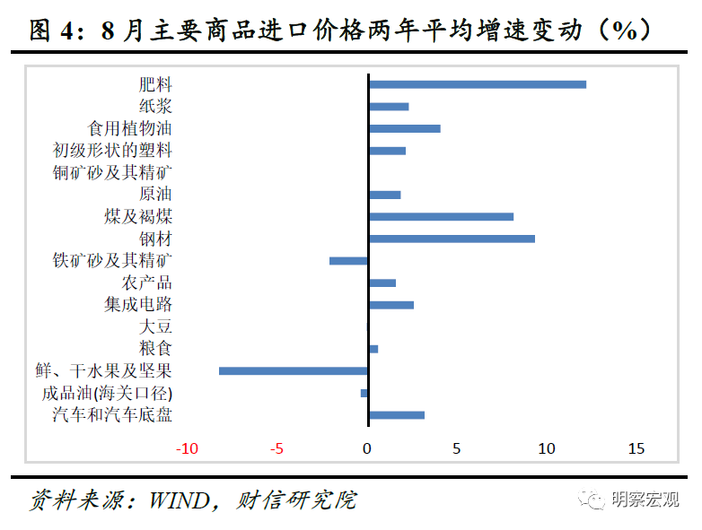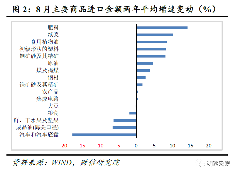 一、大宗商品价格上涨拉高进口增速,内需仍偏弱。8月份主要进口商品量价齐升,其中大宗商品价格持续上涨对进口高增长贡献较大,但持续高企的大宗商品价格挤压国内中下游企业利润,叠加8月多省多点疫情限制供需,导致国内进口需求偏弱。