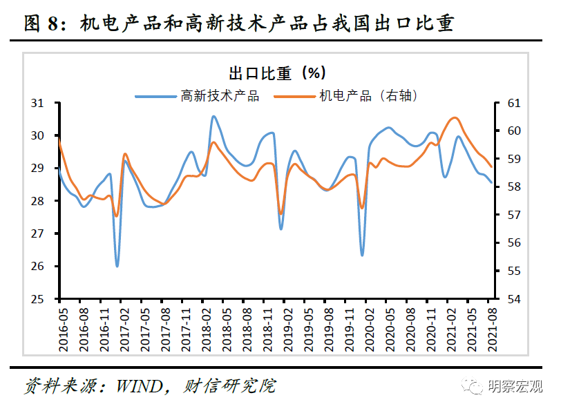 分产品看,机电产品和劳动密集型产品出口均增长。8月份机电产品出口两年平均增速17.3%,高于当月出口两年平均增速(见图7),服装、箱包、家具、塑料制品等劳动密集型产品和防疫物资的出口增速也普遍回升。疫情期间我国出口高景气很大程度上源于对发达经济体机电产品出口的替代,随着海外产能逐步修复和外需回暖,机电产品对出口的拉动作用减弱。如2021年以来机电产品出口增速与总出口的差值趋于收窄(见图7),同时机电产品占出口比重回到往年水平,如2021年1~8月较上月降低0.3个百分点至58.7%,与去年同期持平(见图8)。我国出口逐步从机电产品拉动转向各类产品全面增长,反映了出口增长动能由“替代效应”向外需回暖切换。