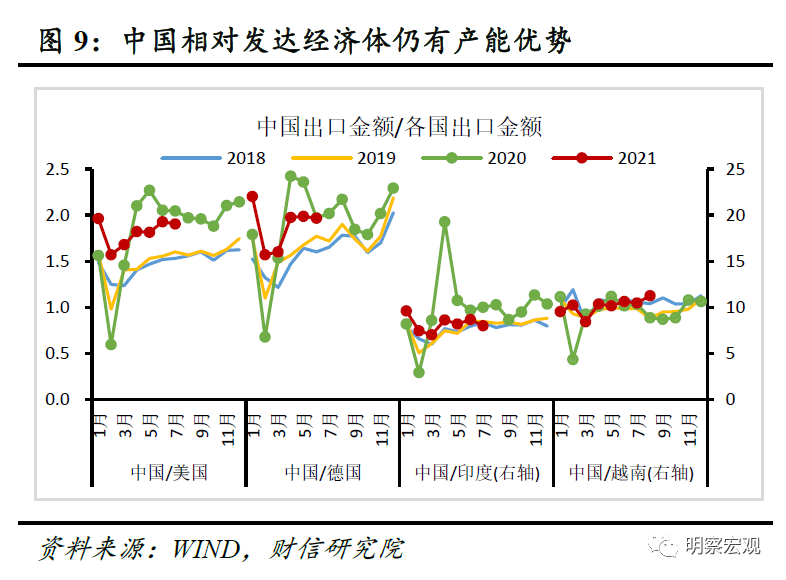一是海外产能有望进一步修复,我国出口下行压力加大。疫情期间我国出口持续高增长,很大程度上是由于疫情引发短期全球生产“停摆”和部分商品需求激增,加上政策力度前所未有,供需出现较大缺口,中国产能率先修复,国内部分产业供给全球,发挥了“补缺口”作用。当前受全球错位复苏和德尔塔病毒影响,我国相对美国、欧盟和东盟等主要经济体仍有产能优势(见图9),是出口保持高增长的主因。展望未来,当前主要发达经济体至少接种一剂次疫苗的人数占比普遍在60%以上,其中18岁以上的劳动年龄人口基本达到群体免疫水平,部分发达经济体疫情防控限制放松和边境限制措施放宽,有利于产能供给的恢复,我国出口替代效应趋弱,带来一定的下行压力。如8月我国新出口订单PMI降至46.7%,连续三个月位于收缩区间。