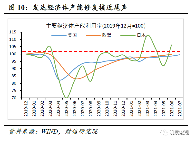 二是预计发达经济体产能修复空间有限。一方面,发达经济体产能利用率进一步提升空间不大,如美国、欧盟、日本等发达经济体产能利用率接近或超过疫前水平(见图10),产能修复接近尾声,预计产能修复进程将放缓,对我国出口份额的冲击将减弱。另一方面,在全球制造业产能由发达经济体转移至新兴经济体的大背景下,发达经济体新增产能动力不足,疫情期间由发达经济体转移至中国的产能大概率仍将留在中国。