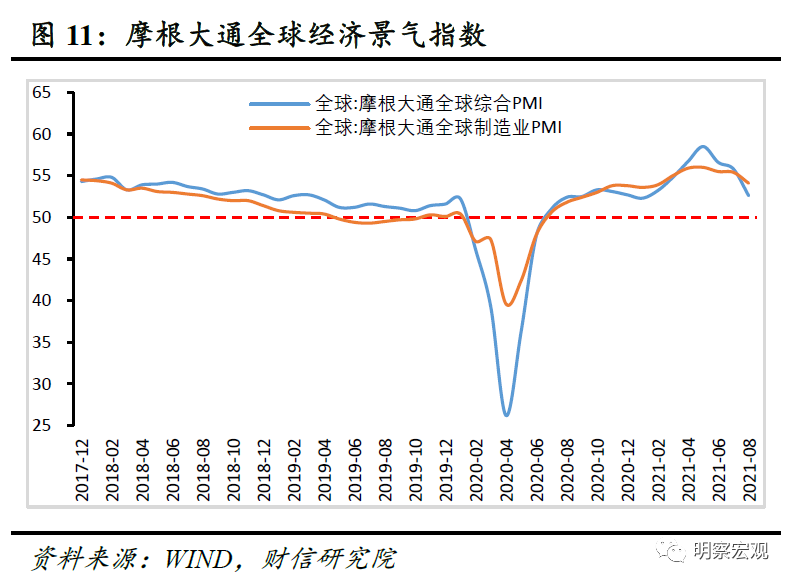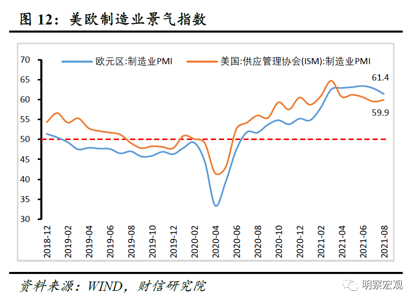 一是全球经济继续复苏。8月份摩根大通全球综合PMI、全球制造业PMI指数录得52.6%、54.1%(见图11),连续14个月位于扩张区间。其中率先复苏的美国、欧元区等发达经济体,经济修复顶点或已过,但复苏势头仍强。如8月份美国、欧元区制造业PMI指数达到59.9%、61.4%,虽较上月有所下降,但仍处于历史高位(见图12)。