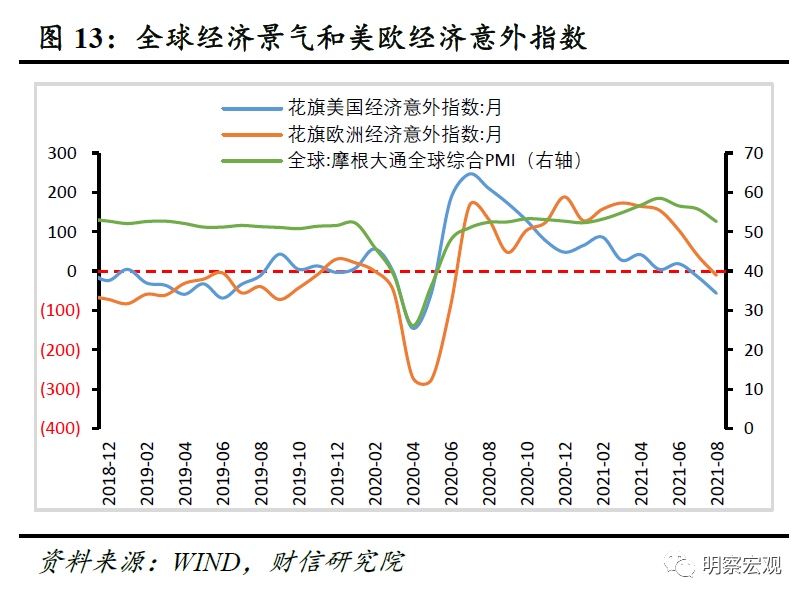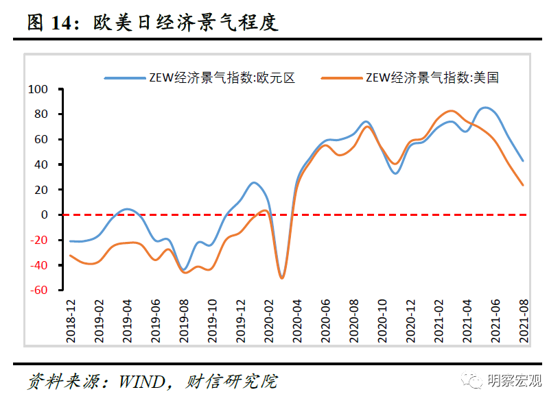 二是受德尔塔疫情冲击,主要发达经济体不确定性加大。8月欧洲和美国的经济意外指数分别为-10.8和-56.3(见图13),表示实际经济情况持续差于人们的普遍预期;欧洲经济研究中心(ZEW)8月经济景气指数显示,欧元区、美国分别录得42.7%、23.4%(见图14),较上月下降18.5、16.6个百分点,表明对欧元区、美国经济在未来6个月的经济预期边际转差。