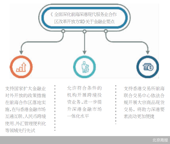 按照《前海方案》的最新要求,扩大金融业对外开放,提升国家金融业在对外开放试验示范窗口和跨境人民币业务创新试验区功能,支持国家扩大金融业对外开放的政策措施在前海合作区落地实施,在与香港金融市场互通互联、人民币跨境使用、外汇管理便利化等领域先行先试。