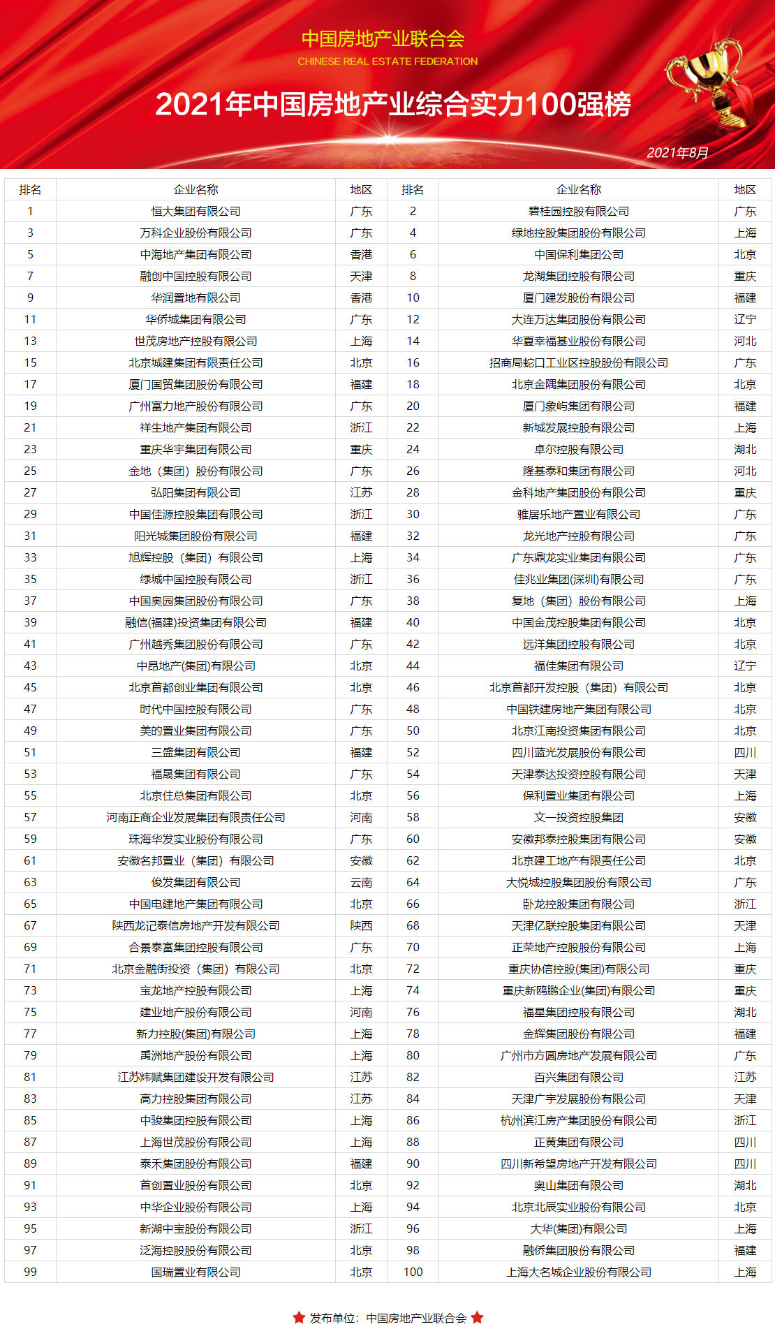 近日,2021年中国房地产业综合实力100强排行榜发布,这是中国房地产业联合会对房地产行业进行全面、科学、独立的企业实力发展调查研究宣传发布工作。通过对全国超过3000家利润总额在1亿元至800亿元之间的中国房地产开发企业进行了数据采集研究,比照国际上通行的做法,主要根据营业收入、资产总额、利润总额、资信等级、社会贡献、业主满意度等指标分析确定候选企业,邀请100位企业高管、学者及官员对经资格审核符合要求的企业进行综合评分,并对部分候选企业进行实地拜访,从中遴选出100家中国房地产业综合实力100强企业。在此基础上通过与世界500强企业进行综合对比分析,进而有针对性地提出促进中国房企做强做大做久的策略建议,在全国范围内形成了巨大的社会影响力。