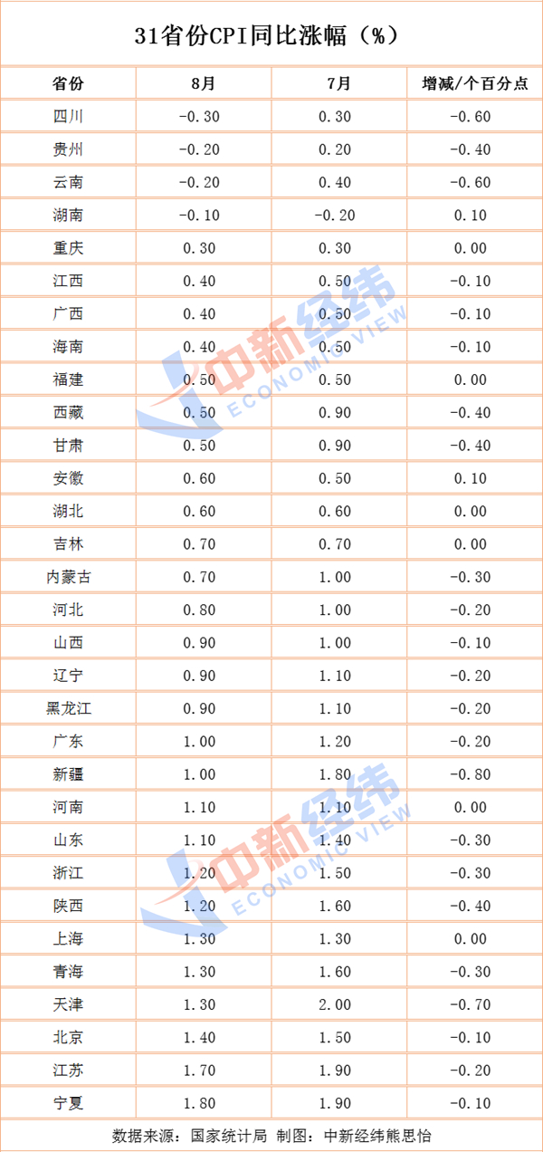 (熊思怡)13日晚间,国家统计局公布31省份8月份居民消费价格指数(CPI),11省份同比涨幅低于全国平均水平,四川等4省份CPI同比下降。