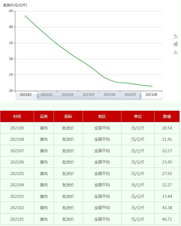 另据农业农村部中农产品批发价格数据,今年以来,全国平均猪肉批发价持续下降,已从1月份的每公斤46.71元,降至9月份的20.54元,降幅达56%