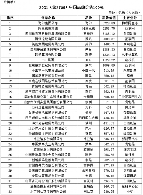 2021(第27届)中国品牌价值100强研究报告日前揭晓,海尔品牌价值3728.09亿,连续20年居首,其后是阿里巴巴3251.75亿、五粮液3188.12亿、腾讯2008.87亿、美的1405.70亿、茅台1388.33亿、联想1336.13、TCL1129.22亿。