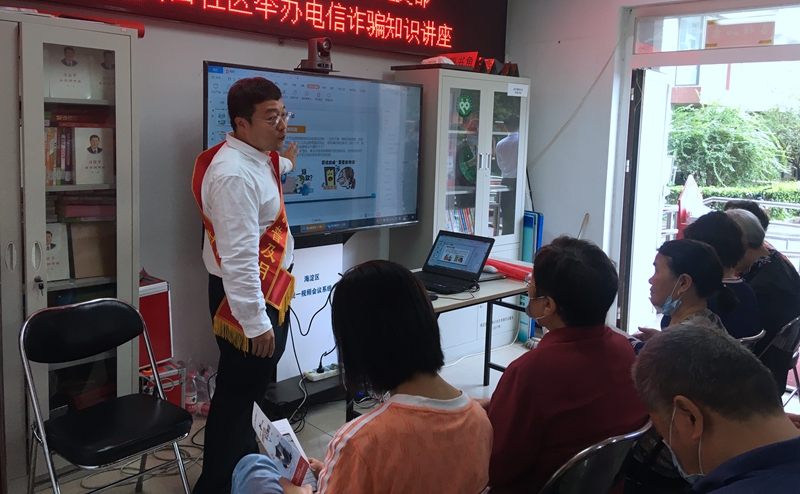 工商银行认真贯彻落实人民银行有关要求,自9月开始,在全行范围内开展一系列“金融知识普及月 金融知识进万家 争做理性投资者 争做金融好网民”宣传活动。近日,工商银行北京海淀二里庄支行工作人员走进北京海淀区花园路某小区,为小区居民宣讲如何防范金融诈骗,并通过发放宣传折页等方式普及金融知识。图为该支行工作人员正在小区里进行金融知识宣讲。