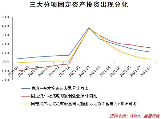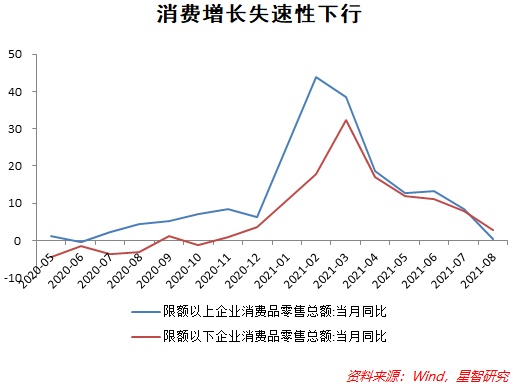 疫情和天气扰动、复苏过程的结构性因素同时存在。服务业消费在7月、8月受到了较明显的短期因素的抑制,从物价看,CPI服务项的价格也普遍回落,反映了需求的在这两个月可能经历了持续回落。复苏进程的分化导致了居民实际收入增速赶不上经济增速,疫情之后的消费持续疲软也一直在印证这一逻辑。但此次限额以上的中高端消费也在明显回落,尽管有汽车消费的重大拖累,但也很大程度上印证了我们之前的担忧:消费已经从结构性问题变成了总量周期性问题。
