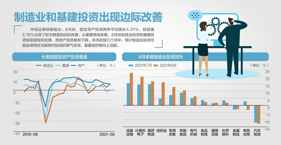 记者注意到,8月工业增加值环比增长0.31%,增速较上月回升0.01个百分点。对此,杨畅认为,与2017~2019年同期表现相比,8月工业生产环比增速偏低,但从工业增加值定基指数来看,2021年要明显高于2017~2019年,属于高位偏低增速。