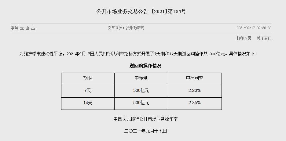 为维护季末流动性平稳,央行公开市场开展500亿元7天期和500亿元14天期逆回购操作,中标利率分别为2.20%、2.35%。另外,今日有100亿元逆回购到期,单日净投放900亿元。