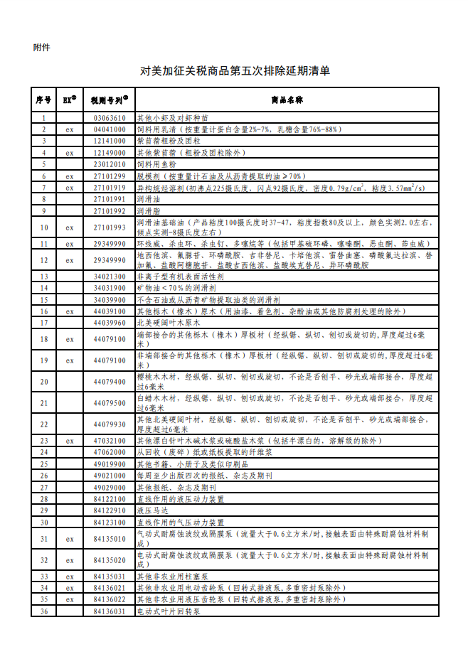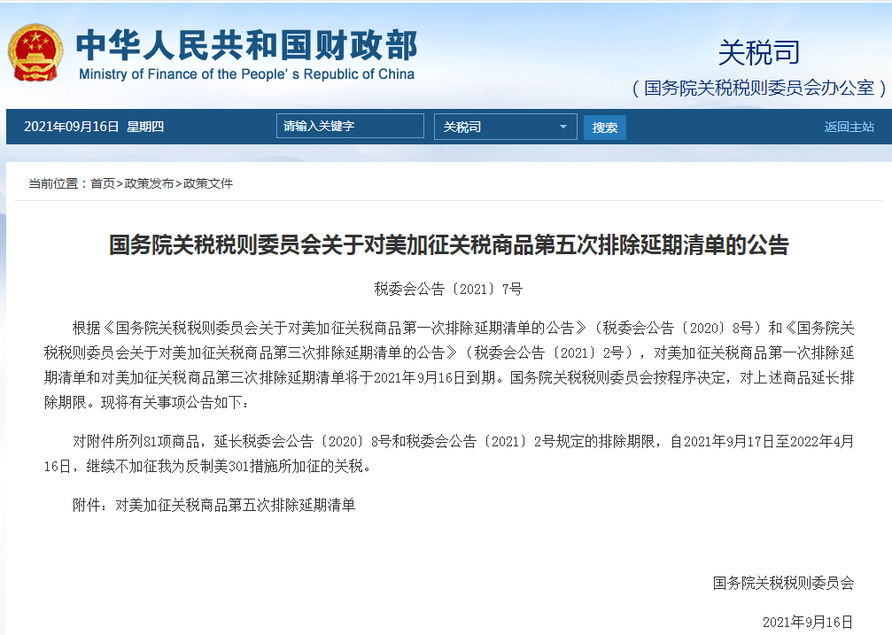 对附件所列81项商品,延长税委会公告〔2020〕8号和税委会公告〔2021〕2号规定的排除期限,自2021年9月17日至2022年4月16日,继续不加征我为反制美301措施所加征的关税。
