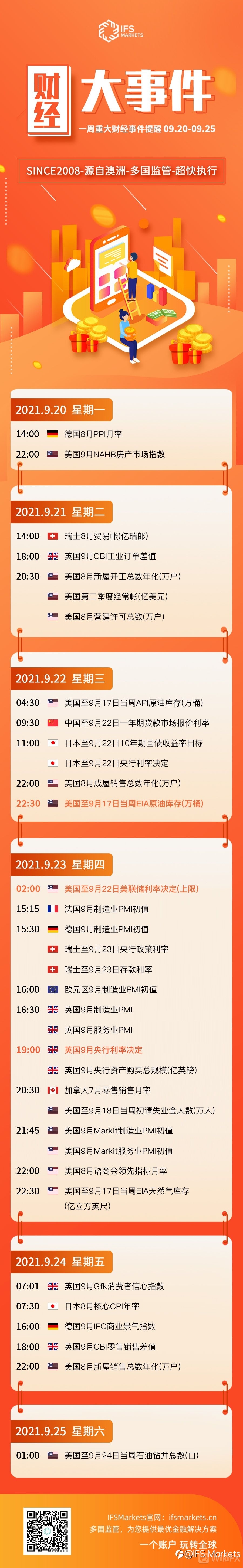 中国人民银行将于周三公布9月一年期和五年期贷款市场报价利率;美联储FOMC会议将于周四公布9月利率决议,进一步释放关于taper的信号,美联储主席鲍威尔将在利率决议公布后召开新闻发布会。英国央行也将公布利率决议。