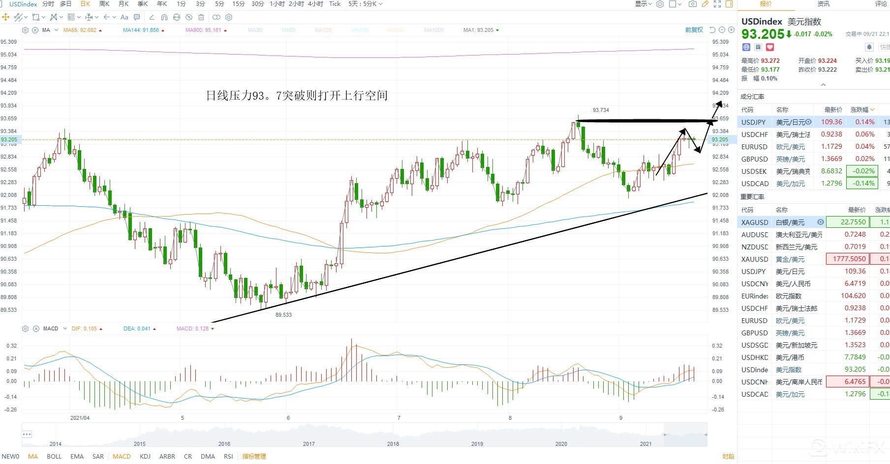 美元指数继续反弹,但是今晚美联储利率决议若鹰派言论则不排除继续上攻的可能性,目前来到临界点附近,若上方突破前高93.7则有望打开上行空间,下方支撑92.5等待消息面落地,金价方面连续调整之后反弹,等待美联储利率决议,美原油突破之后回踩,短期价格依然维持在多头区间之内,且库存继续下降,关注今晚EIA库存数据变化