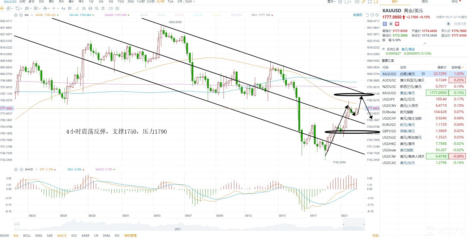 黄金震荡反弹,但是并未突破下降趋势线,目前基本面上等待美联储利率决议为主,短期需要注意美债收益率得变化,若美债收益率突破颈线位置上行,则不排除金价再次回踩的可能性,日内按照反弹对待,趋势线压力1790附近成为短期多空分水岭,若站稳1790则重返多头区间,下方重要支撑1750