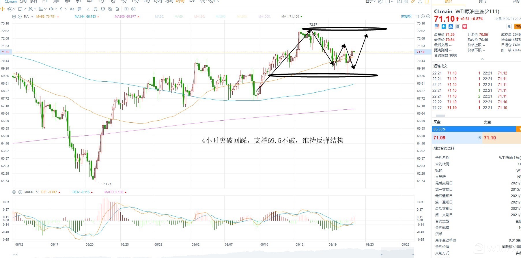美原油库存继续下降,因此短期油价继续上行,但是市场风险偏好下行,且风险资产连续走弱,影响油价走强,目前技术层面上属于突破之后的回踩,那么在短期价格没有跌破多空分水岭69.5之前,维持震荡反弹为主,当前重要压力73美元附近,日内关注EIA数据,等待方向选择为主
