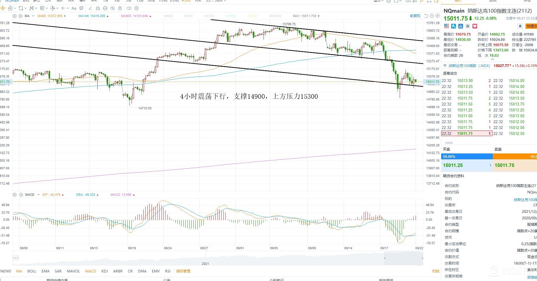 纳斯达克指数连续调整,短期4小时结构属于震荡下行,在测试支撑之后等待方向选择,基本面上风偏下行,且美债收益率上行,打压指数多头,日内需要关注4小时级别支撑14900,这里是短期多空分水岭,若跌破则打开下行空间,不排除深度回调的可能性,上方压力15300,日内偏向震荡下跌为主,等待压力测试