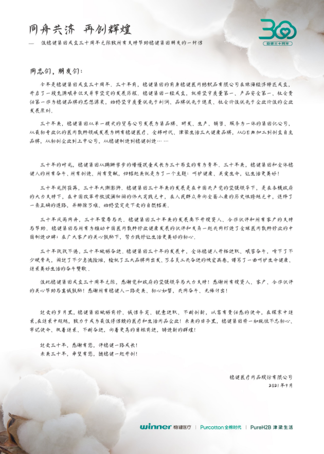 近日,稳健医疗发布“同舟共济,再创辉煌”——值稳健医疗成立三十周年之际致所有支持帮助稳健医疗朋友的一封信(以下简称《致谢信》),回顾公司30年的积淀与成长,并向社会各界表示感谢。