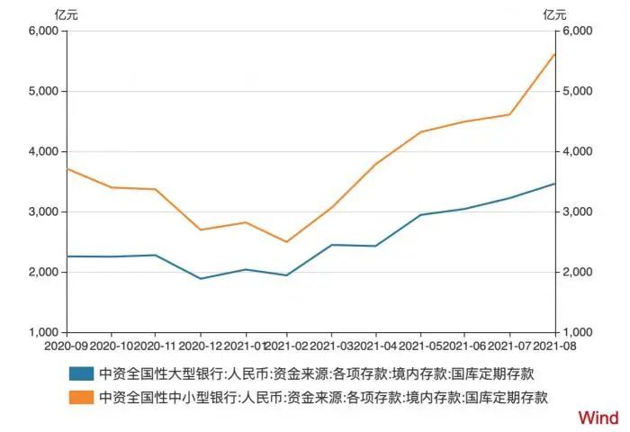 银行负债端压力持续,也表现在银行对国库定期存款的依赖。数据显示,截至8月末,大型银行国库定期存款为3462.38亿元,较1月末增加1423.77亿元;中小型银行国库定期存款为5614.54亿元,较1月末增加2796.32亿元,几乎翻倍。