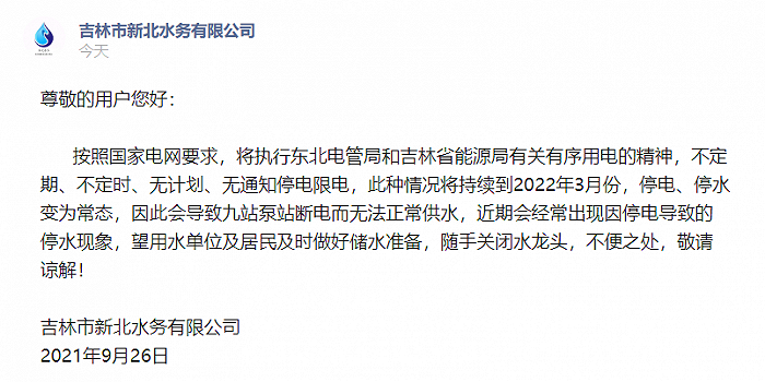 吉林市新北水务有限公司9月26日发布公告,按照国家电网要求,将执行东北电管局和吉林省能源局有关有序用电的精神,不定期、不定时、无计划、无通知停电限电,此种情况将持续到2022年3月份,停电、停水变为常态,因此会导致九站泵站断电而无法正常供水,近期会经常出现因停电导致的停水现象,望用水单位及居民及时做好储水准备,随手关闭水龙头,不便之处,敬请谅解。
