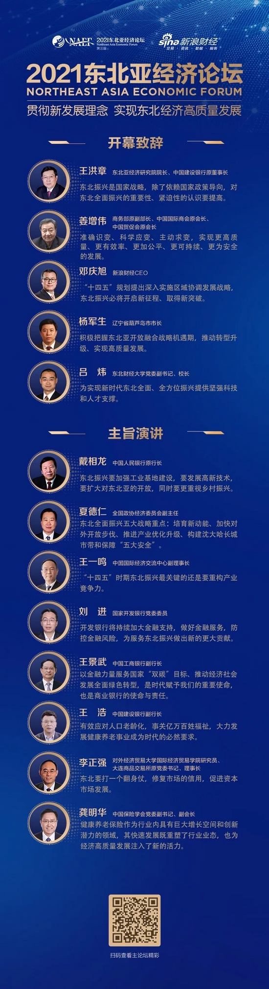 本届东北亚经济论坛主题为“贯彻新发展理念,实现东北经济高质量发展”,东北亚经济研究院院长、中国建设银行(601939,股吧)原董事长王洪章、中国人民银行原行长戴相龙等十二位重量级嘉宾齐聚线上,围绕东北经济高质量发展展开探讨,从乡村振兴、绿色金融、发展健康产业等多个角度,为如何构建新发展格局献计献策。