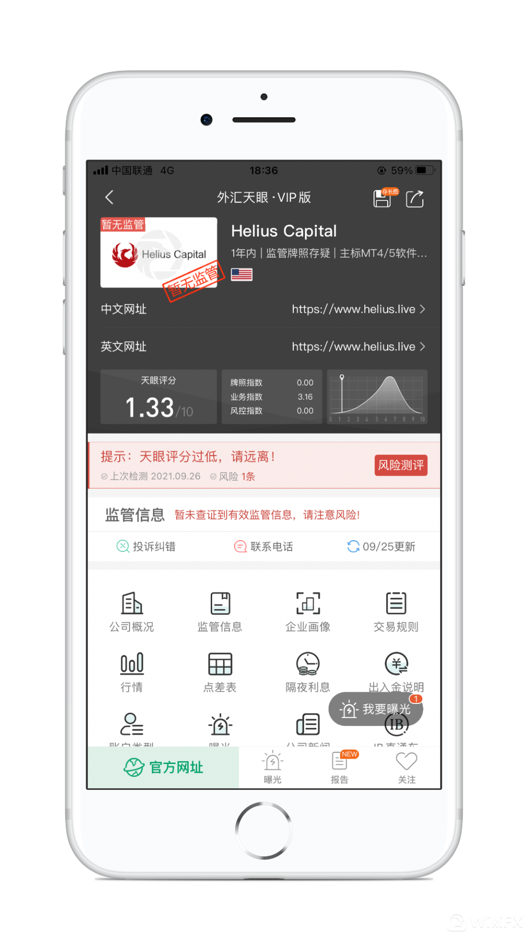 在外汇天眼中查询helius capital,天眼评分1.33分,当前暂无任何实际有效监管,存在巨大风险,建议还在该平台交易的投资者尽快远离。