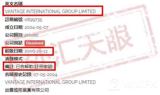 Vantage国际集团的全称为Vantage International Group,通过查询香港曾经有过这个公司,为什么说曾经呢?因为在2006年该公司就已经宣告解散了。