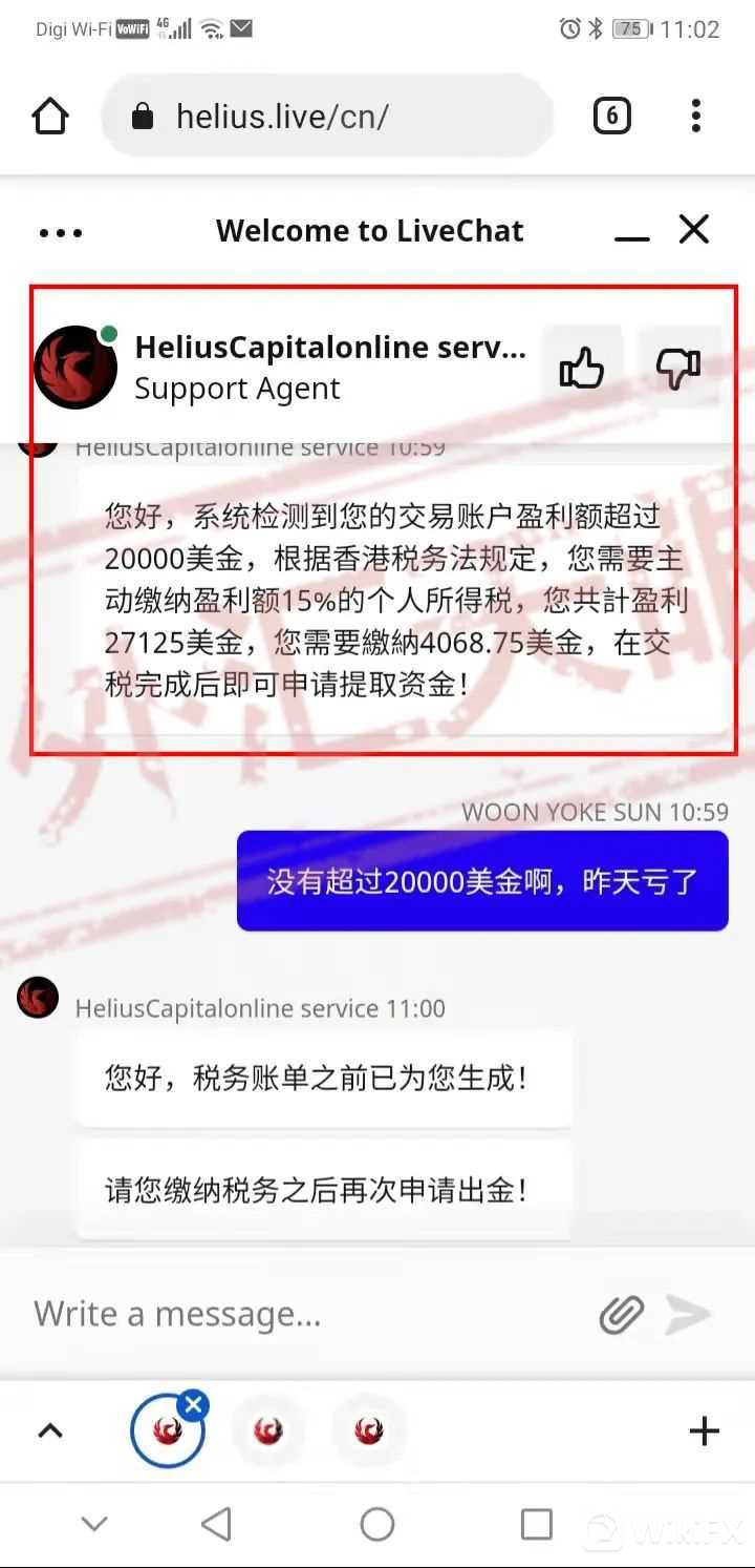 但是好景不长,温女士察觉出helius capital似乎不像个正规平台,便再次尝试出金,结果失败了,平台给出的理由是账户盈利超过了20000美金需要缴纳4000多美金的税费才能出金。