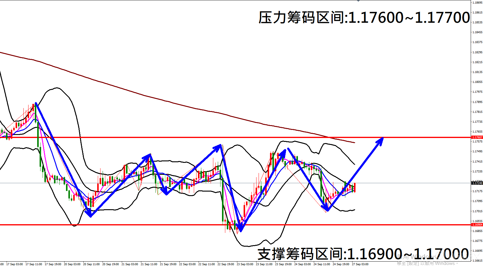 今日欧元/美元(9月27日)早盘在1.17178附近,从技术分析面切入,1小时级别观察走势架构符合上周五(24日)预测K棒出现拉回修正行情,目前K棒反弹落在布林通道中轨与上轨之间,同时开口转折朝上,因此有机会持续反弹上涨。