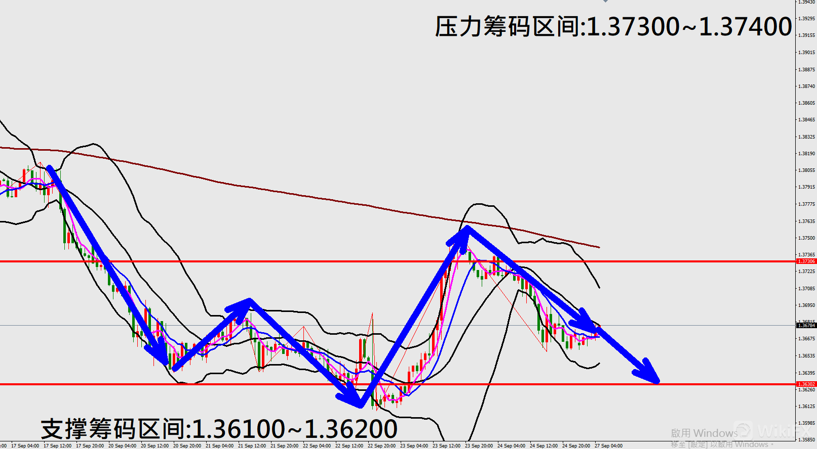 今日英镑/美元(9月27日)早盘在1.36629附近,从技术分析面切入,1小时线级别观察走势上周五(24日)预测K棒出现拉回修正行情,目前K棒落在布林通道中轨与下轨之间,同时开口持续朝下,因此有机会持续向下修正。