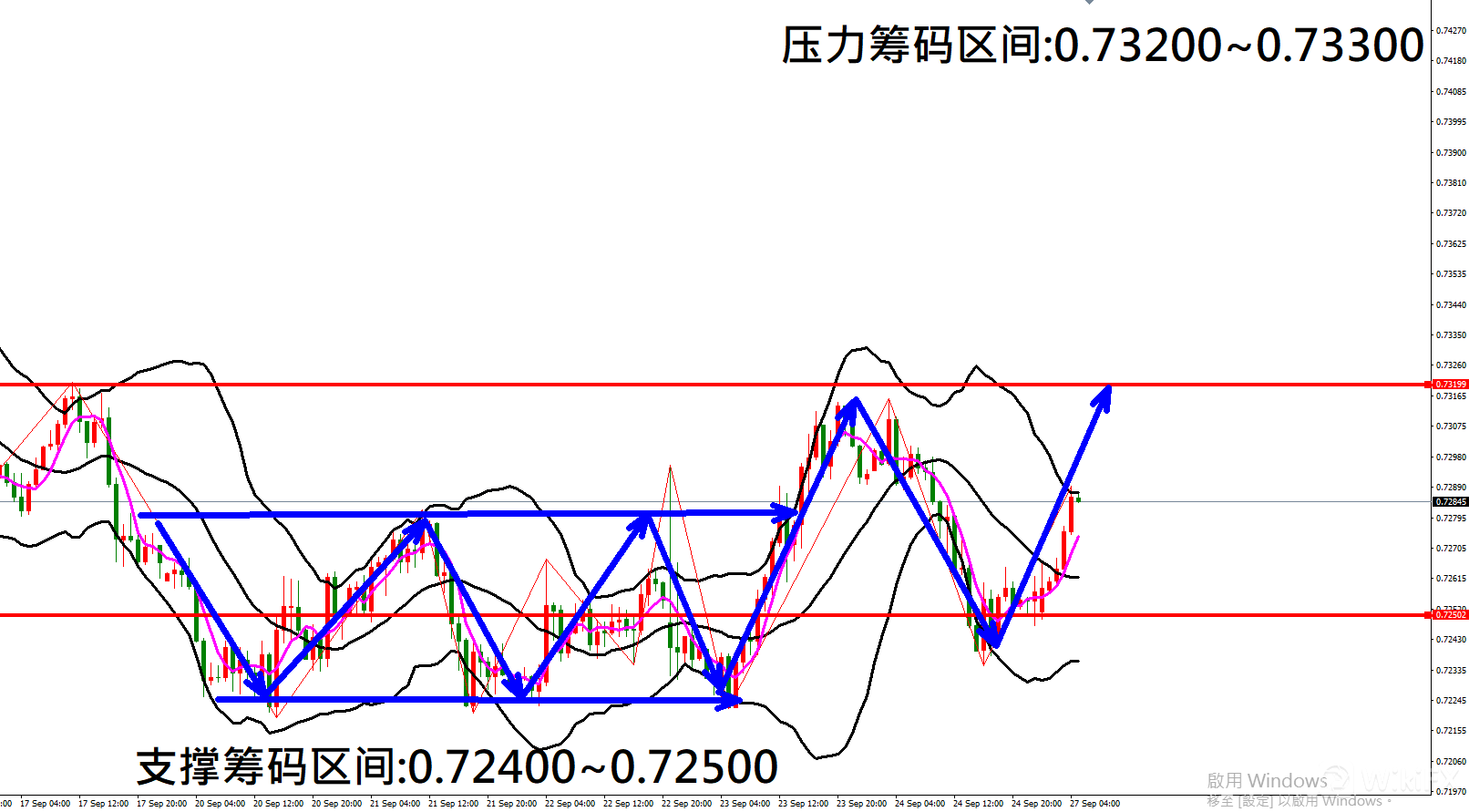 今日澳元/美元(9月27日)早盘在0.72940附近,从技术分析面切入,1小时线级别观察走势架构上周五(24日)K棒触底反弹上涨,目前K棒反弹落在布林通道中轨与上轨之间,同时开口转折朝上,因此有机会持续反弹上涨。