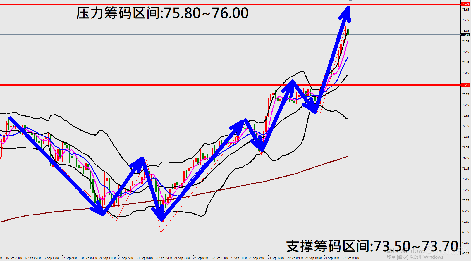 今日美国原油(9月27日)早盘在74.21附近,从技术分析面切入,1小时线级别观察走势架构符合上周五(24日)预测K棒出现强劲反弹上涨行情,目前K棒落在布林通道中轨与上轨之间,同时开口持续朝上扩张,因此有机会再度反弹上涨。