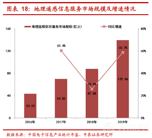 数字地球技术完成前期的技术导入,行业正处蓬勃发展期。根据中国电子信息产业统计年鉴,我国地理遥感信息服务市场规模近几年实现高速增长。2016年-2019年市场规模分别为43.53亿元、69.82亿元、87.88亿元和139.46亿元,年化复合增速高达47.42%。行业规模已经超百亿元,下游需求仍在加速释放,行业规模有望持续维持高速增长。