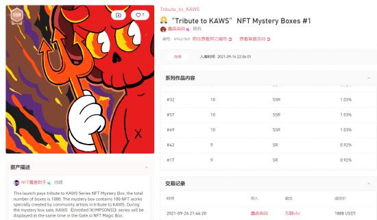 据Gate.io NFT魔盒最新数据显示,致敬KAWS系列盲盒上线后,二级市场的最高成交价短时间内便达到了1888 USDT,溢价3676%。致敬KAWS系列盲盒也成为了Gate.io NFT魔盒热门盲盒第一。截至目前,致敬KAWS系列盲盒在二级市场的价格还在持续飙升。