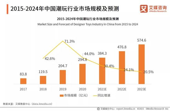 根据“iiMedia Research”数据显示,2020年中国潮玩经济市场规模达到294.8亿元。受惊喜经济和社交情感需求等因素影响,中国潮玩受欢迎程度还在不断上升,预计中国潮玩市场规模将保持扩张态势,2021年将以30.4%的增速升至384.3亿元。