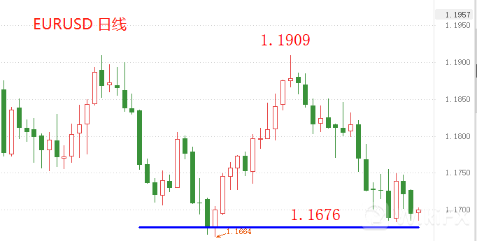 EURUSD中期支撑位1.1676,虽然当前处于下跌波段,但需要突破1.1676,市价才能进一步下行。