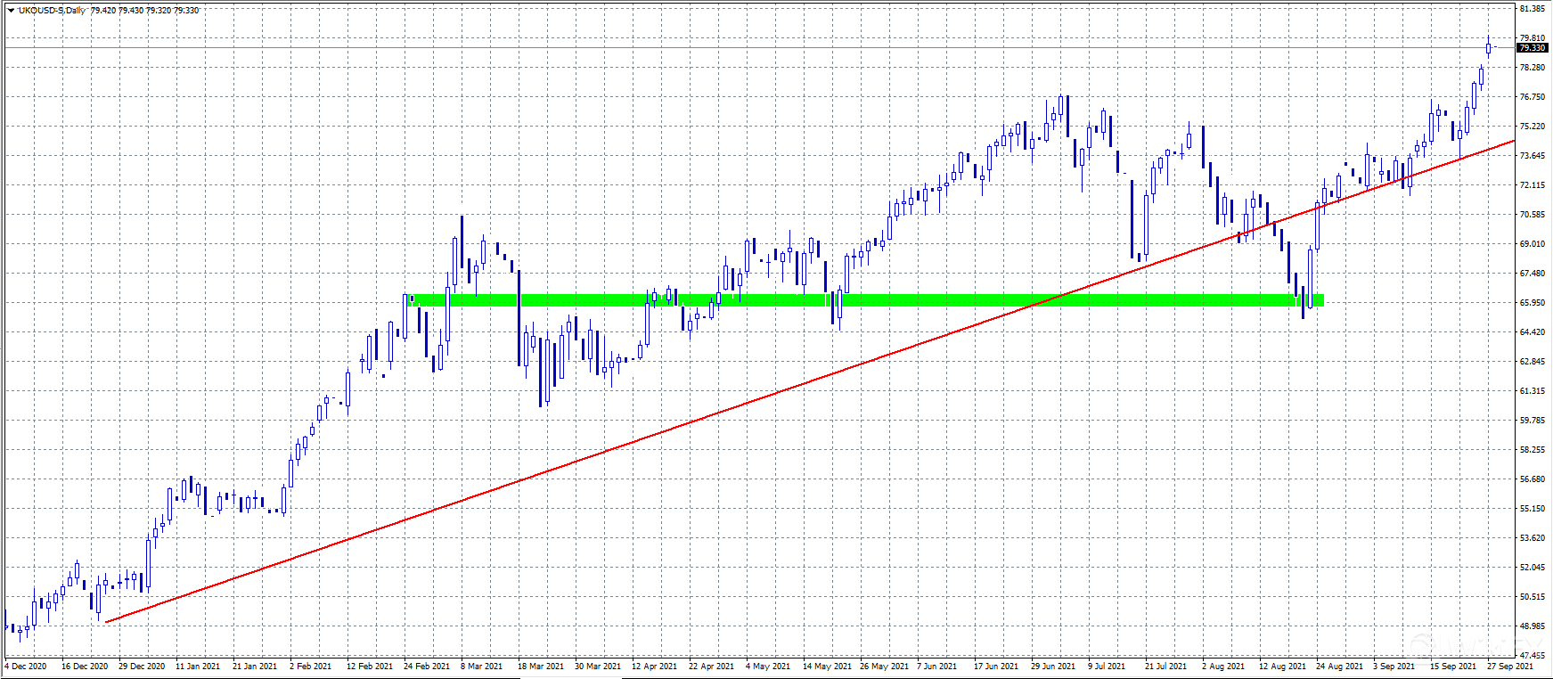 5. 路透纽约9月27日- 油价周一连续第五天上涨,布兰特原油价格升至2018年10月以来的最高水平,逼近每桶80美元,原因是投资者担心世界部分地区需求上升导致供应趋紧。