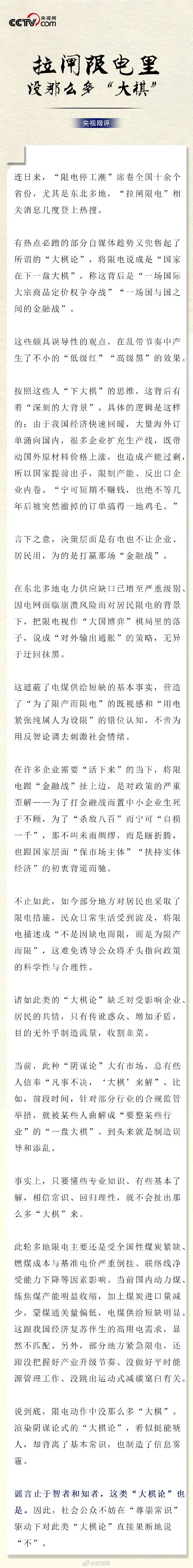 说到底,限电动作中没那么多“大棋”。渲染阴谋论式的“大棋论”,看似挺能唬人,却背离了基本常识,也制造了信息雾霾。