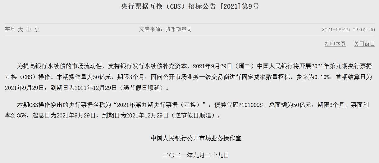 中新经纬9月29日电 央行网站29日公告,9月29日(周三)央行将开展2021年第九期央行票据互换(CBS)操作。