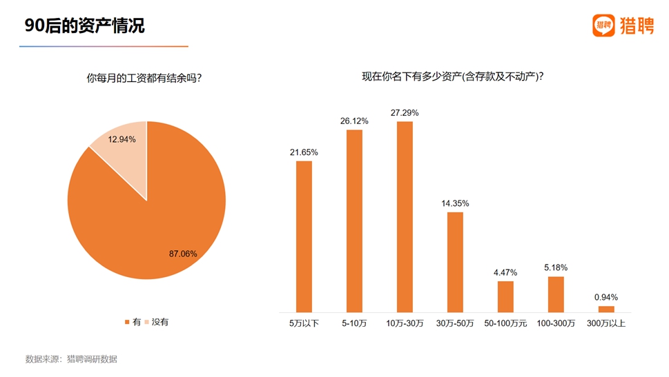 根据猎聘调研,91.29%的“90后”职场人表示自己有存钱习惯,没有存钱习惯的仅占8.71%。每月工资都有结余的占到87.06%,仅有12.94%是“月光族”。